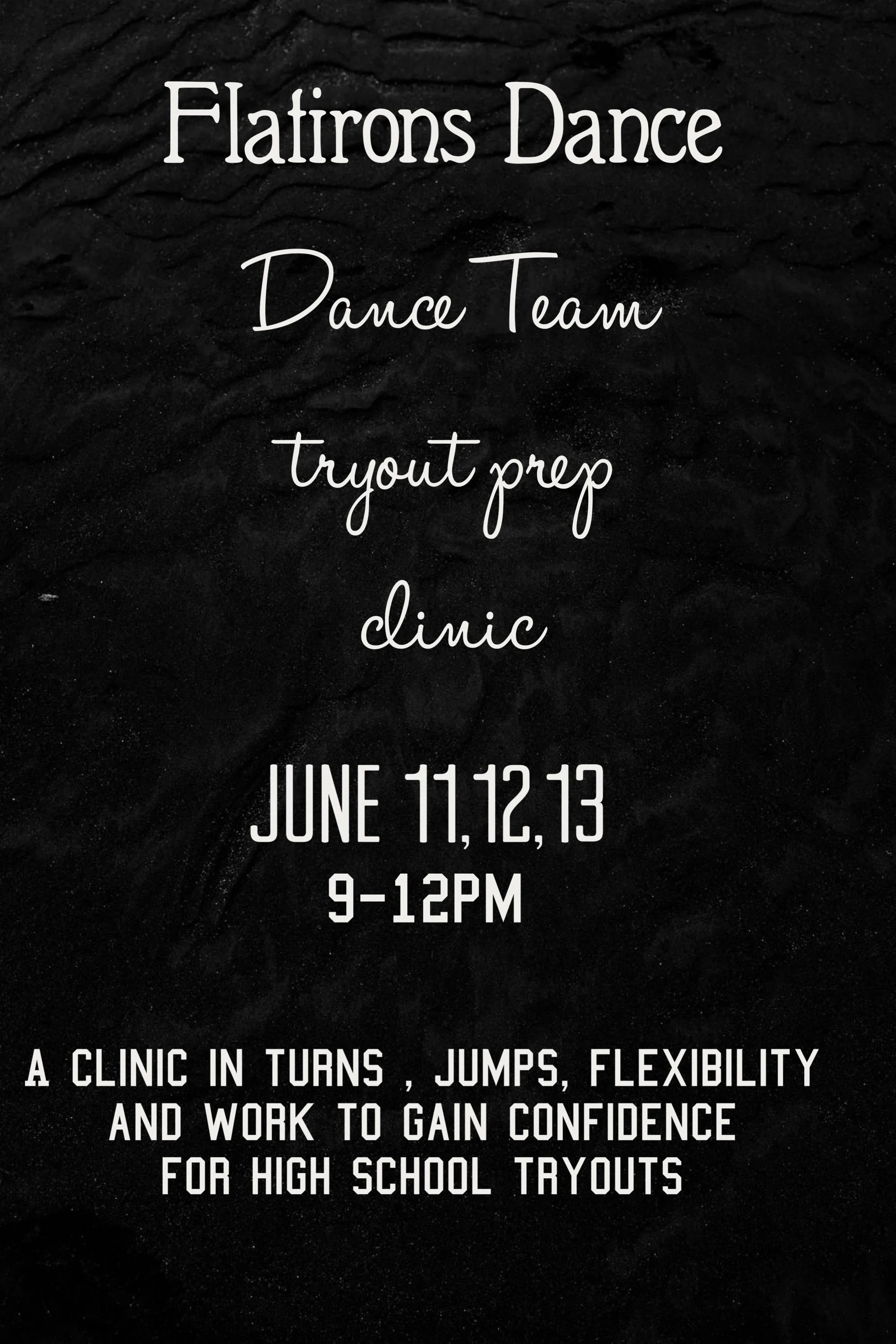 Dance Team Tryout Prep Camp Tuesday, June 11, 2024 9:00 AM Thursday, June 13, 2024 12:00 PM Google Calendar ICS This camp is designed for dancers interested in trying out for competition team and or high school poms. There will be different age groups split up amongst studios to work on age appropriate skills. Register Here!